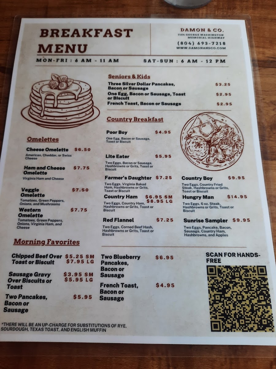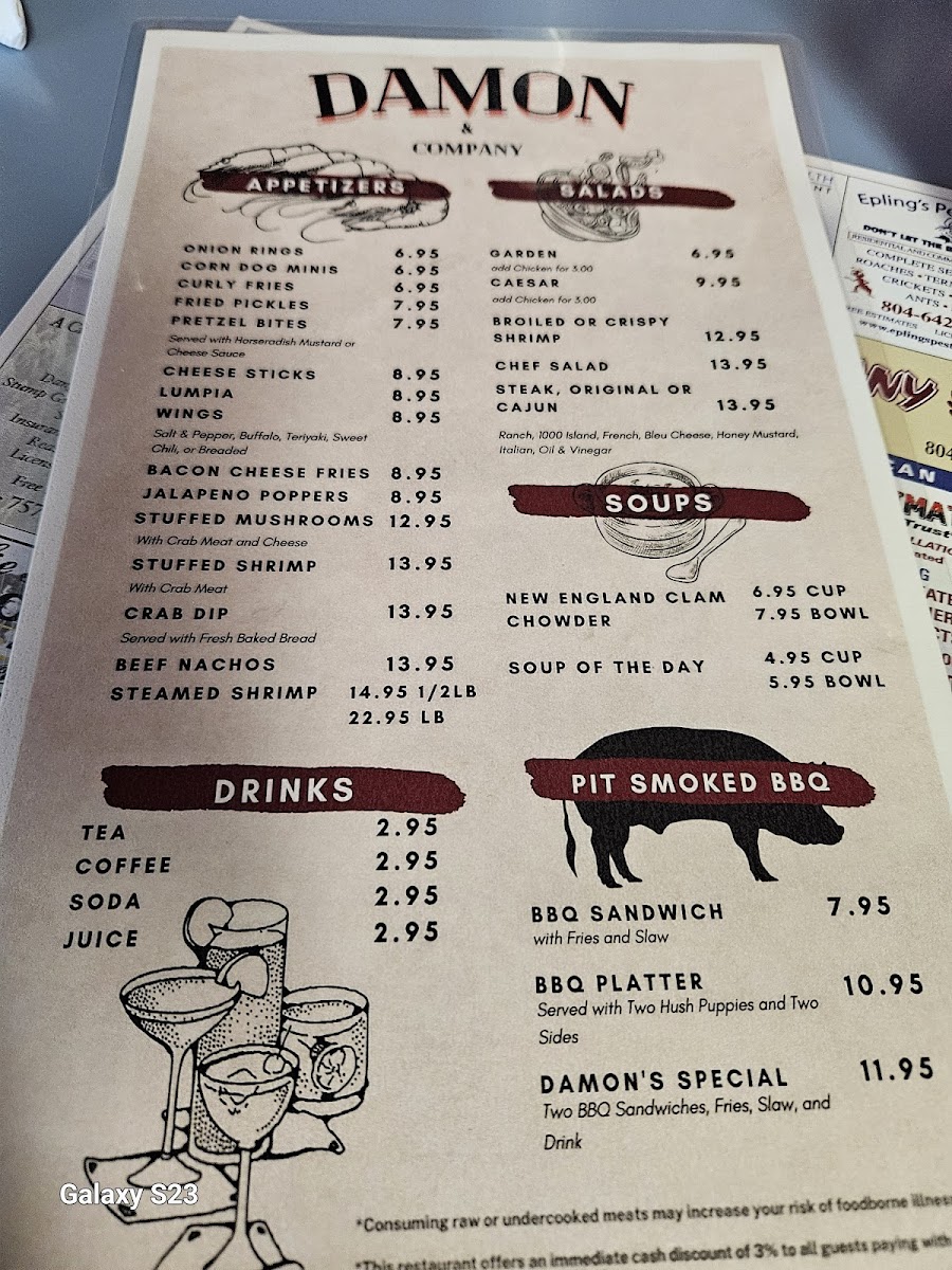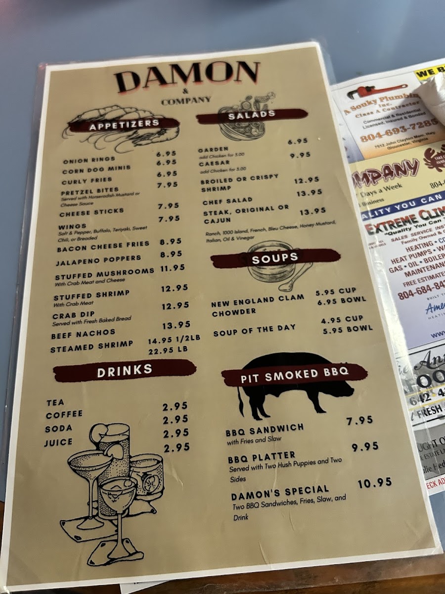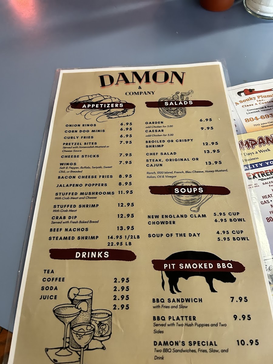 Damon & Company offers a straightforward, welcoming menu that blends classic comfort food with casual bar favorites. Whether you're stopping by for a relaxed breakfast, a laid-back lunch, or an easy evening out, the menu is designed to complement the friendly, unpretentious atmosphere of the space.